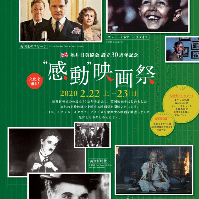 【メトロ劇場】福井日英協会 設立30周年記念 『感動映画祭(2/22、2/23)』開催のお知らせ