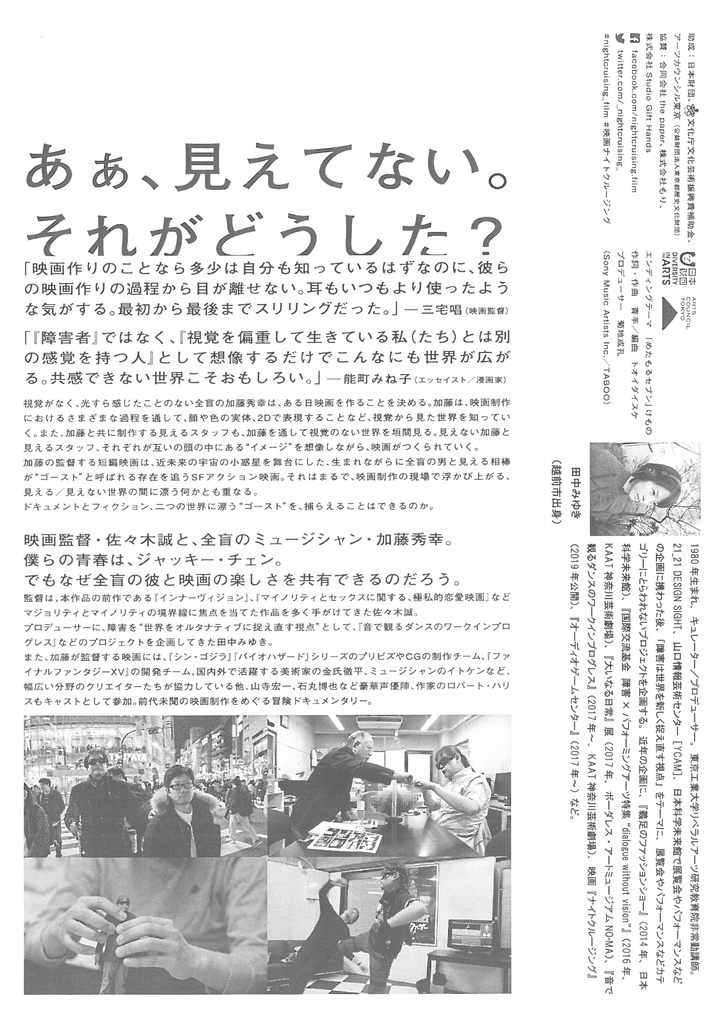 「あぁ、見えてない。それがどうした?」視覚がなく、光すら感じたことのない全盲の加藤秀幸は、ある日映画を作ることを決める。加藤は、映画制作におけるさまざまな過程を通して、顔や色の実体、2Dで表現することなど、視覚から見た世界を知っていく。また、加藤と共に製作する見えるスタッフも、加藤を通して視覚のない世界を垣間見る。見えない加藤と見えるスタッフ、それぞれが互いの頭の中にある“イメージ”を想像しながら、SF短編映画がつくられていく。《演出上の都合により、冒頭約10分間は音声のみとなります。また、終盤にエンドロールが一度出ますが、その後もドキュメンタリーは続きます。最後までお楽しみください。》(C) 一般社団法人being there、インビジブル実行委員会